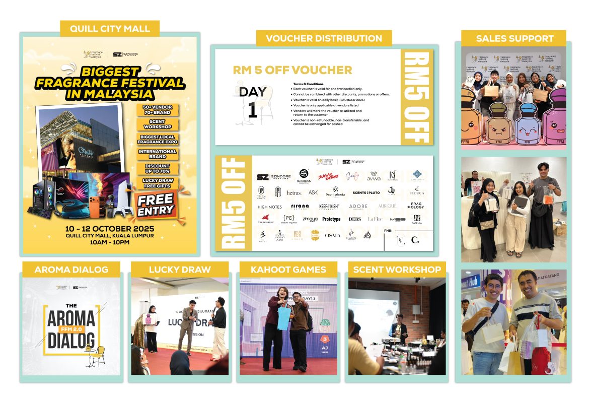 Following the success of FFM1, Fragrance Festival Malaysia 2.0 was held at Quill City Mall, Kuala Lumpur from October 10-12, 2025. The festival showcased over 50 local and Southeast Asian fragrance brands, featured special sessions with sponsors like Szindore, Beauboss and was attended by fragrance lovers, creators, and brands.